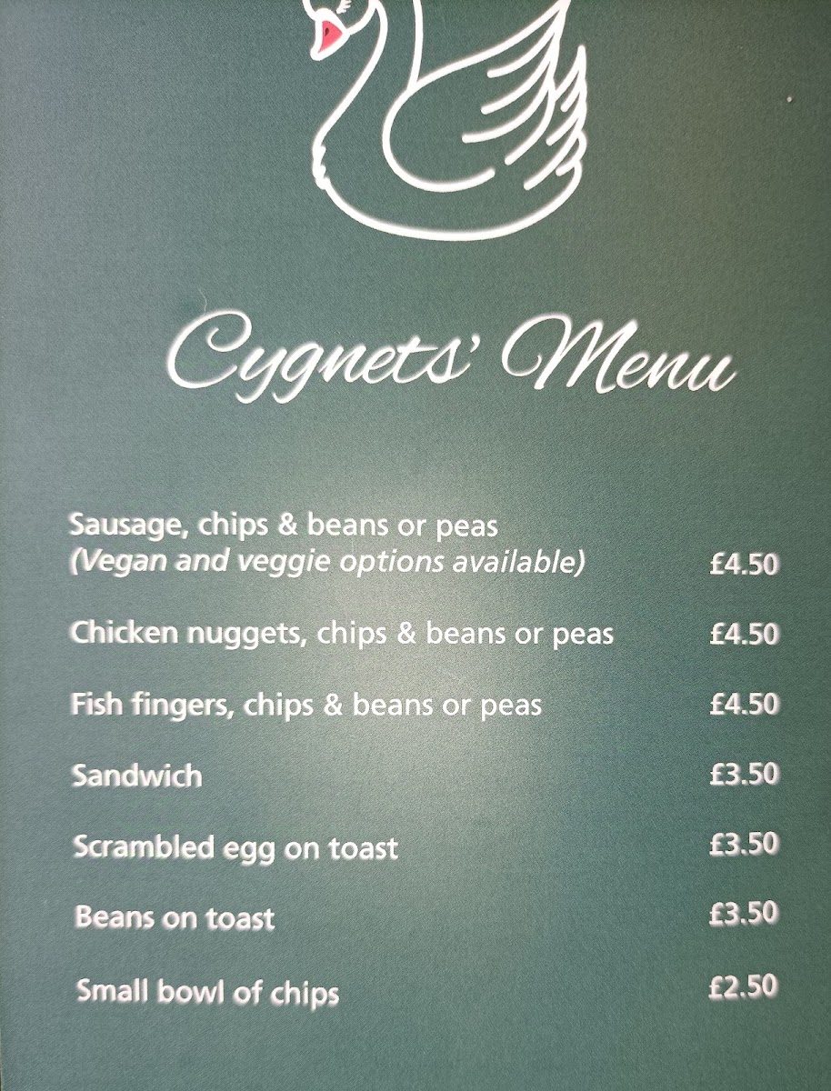 Cygnets Menu: This group focuses on child-friendly meals, including classic selections such as sausage, chicken nuggets, or fish fingers, each served with chips and beans or peas. Simpler items like scrambled egg on toast, beans on toast, and a small bowl of chips are also offered, providing light choices for younger diners or snacks.